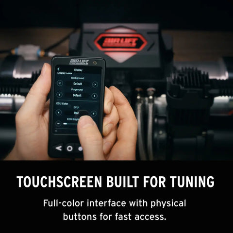 The ALP4 air management system redefines what’s possible for air suspension control, combining cutting-edge hardware with smarter, more seamless functionality. This system features a compact, all-in-one manifold, which houses the ECU, solenoids, and pressure sensors, crafted from anodized black billet aluminum for durability and a sleek, show-ready appearance. Paired with a full-color touchscreen controller framed in anodized aluminum and equipped with four tactile physical buttons, this system offers immediate control for your presets, 4-corner manual control, axle adjustments, full air-out and other adjustable functions. With mobile app integration, ALP4 allows you to use and fine-tune your setup from anywhere, ensuring ultimate control.