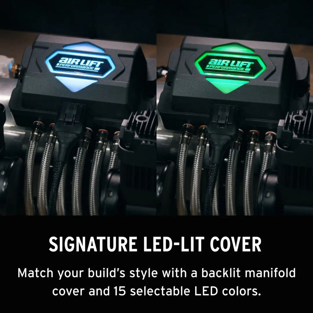 - Anodized black billet aluminum manifold block with LED-lit top cover and rotatable logo plate