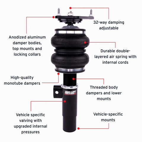 Lower your Audi or VW and raise your standards to Air Lift Performance. The kit features progressive-rate, double-bellows air springs placed over high-performance monotube struts. With 32 levels of damping adjustability, threaded lower mounts and camber plates, the struts allow for a wide range of customization.
