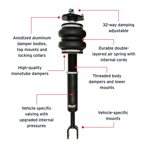 Kit Includes: Complete front Air Suspension kit with set of (2) front dampers with (2) air springs, (1) spanner wrench, (2) damping adjustment knobs, (2) damping knob grommets, (2) stainless leader lines, (2) 1/4" FNPT x 1/4" PTC fittings and (2) 1/4" FNPT x 3/8" PTC fittings.