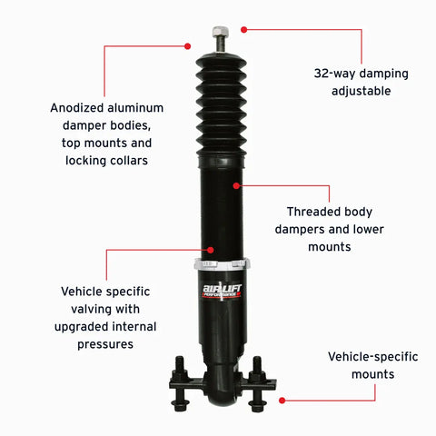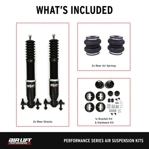 Lower your Mustang S550 or S650 and raise your standards to Air Lift Performance. The rear kit features progressive-rate, double-bellows air springs and high-performance monotube shocks. With 32 levels of damping adjustability and threaded adjustable lower mounts, the shocks allow for full tuning.