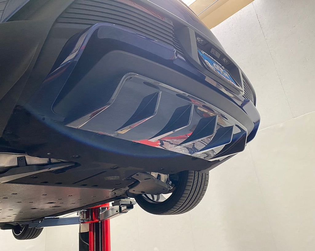 The Porsche Taycan rear end styling really shows off its performance capability. As an automotive first for Porsche, the electric vehicle has Porsche performance exuding from its soul. Enhancing the electric vehicle is limited but it can certainly be done in the styling department. Vivid Racing's VR Aero brand has created one of the most amazing looking aero kits for the Porsche Taycan. Part of the aero kit components is this rear diffuser. The diffuser is designed to flow with the body lines while giving that extra aggressiveness to the rear end. The diffuser is full carbon fiber, manufactured from pre-preg material. Pre-preg has that glossy finish but does not require layers of clear coat to be applied after vacuum bagging. With this process, the quality and finish is simply the best! The diffuser attaches to the under body using both strong double sided adhesive tape as well as mounting to the factory bolt locations. If you are wanting to dress your Porsche Taycan up, these carbon fiber aero parts from Vivid Racing are the answer.